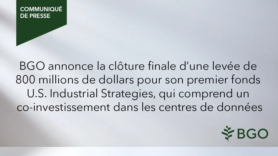 BGO annonce la clôture finale d’une levée de 800 millions de dollars pour son premier fonds U.S. Industrial Strategies, qui comprend un co‑investissement dans les centres de données